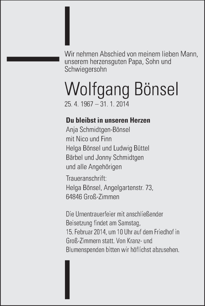 Hier finden Sie alle Traueranzeigen aus der Zeitung, die bisher für Wolfgang Bönsel erschienen sind. Weitere Traueranzeigen, die in der Zeitung erscheinen, werden hier ebenfalls aufgelistet
