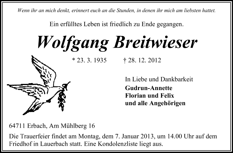 Hier finden Sie alle Traueranzeigen aus der Zeitung, die bisher für Wolfgang Breitwieser erschienen sind. Weitere Traueranzeigen, die in der Zeitung erscheinen, werden hier ebenfalls aufgelistet