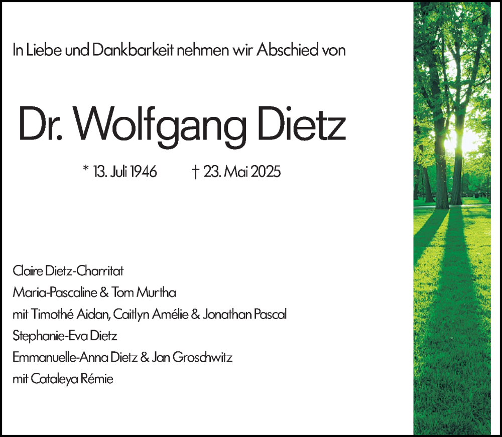 Hier finden Sie alle Traueranzeigen aus der Zeitung, die bisher für Wolfgang Dietz erschienen sind. Weitere Traueranzeigen, die in der Zeitung erscheinen, werden hier ebenfalls aufgelistet