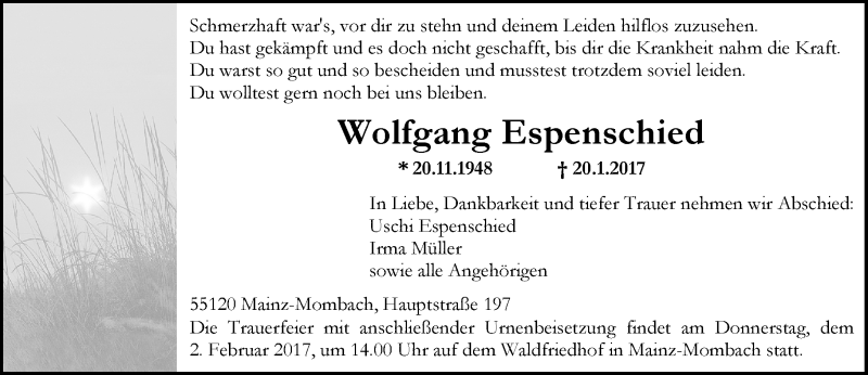 Hier finden Sie alle Traueranzeigen aus der Zeitung, die bisher für Wolfgang Espenschied erschienen sind. Weitere Traueranzeigen, die in der Zeitung erscheinen, werden hier ebenfalls aufgelistet