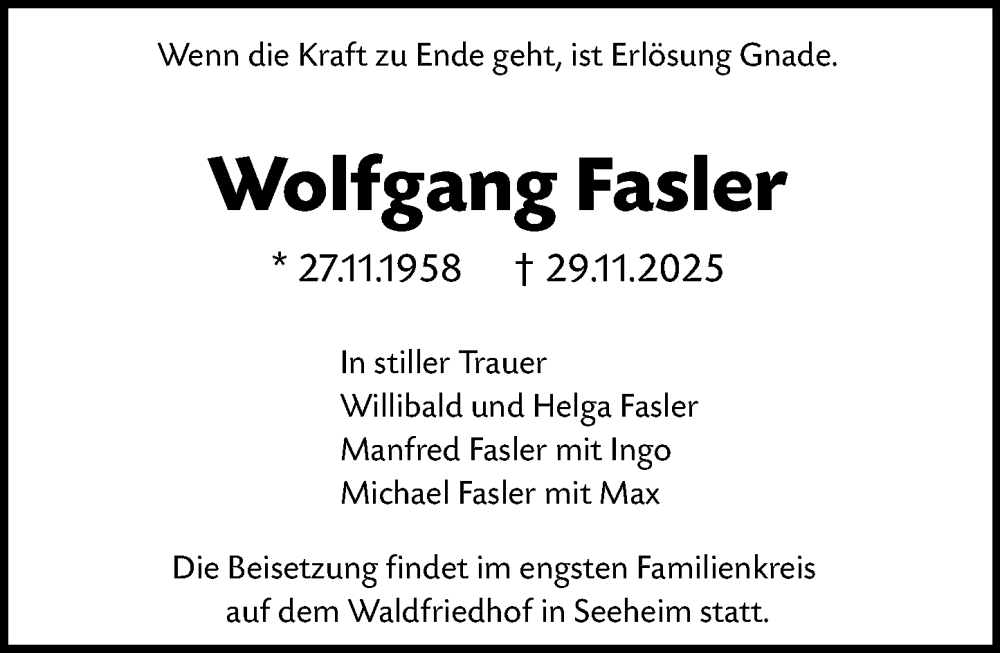 Hier finden Sie alle Traueranzeigen aus der Zeitung, die bisher für Wolfgang Fasler erschienen sind. Weitere Traueranzeigen, die in der Zeitung erscheinen, werden hier ebenfalls aufgelistet