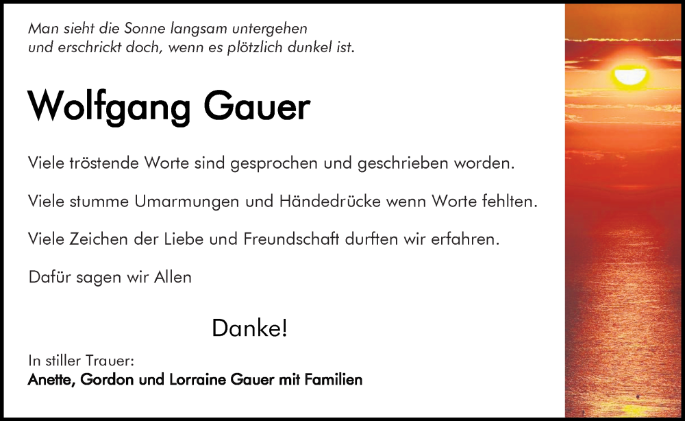 Hier finden Sie alle Traueranzeigen aus der Zeitung, die bisher für Wolfgang Gauer erschienen sind. Weitere Traueranzeigen, die in der Zeitung erscheinen, werden hier ebenfalls aufgelistet