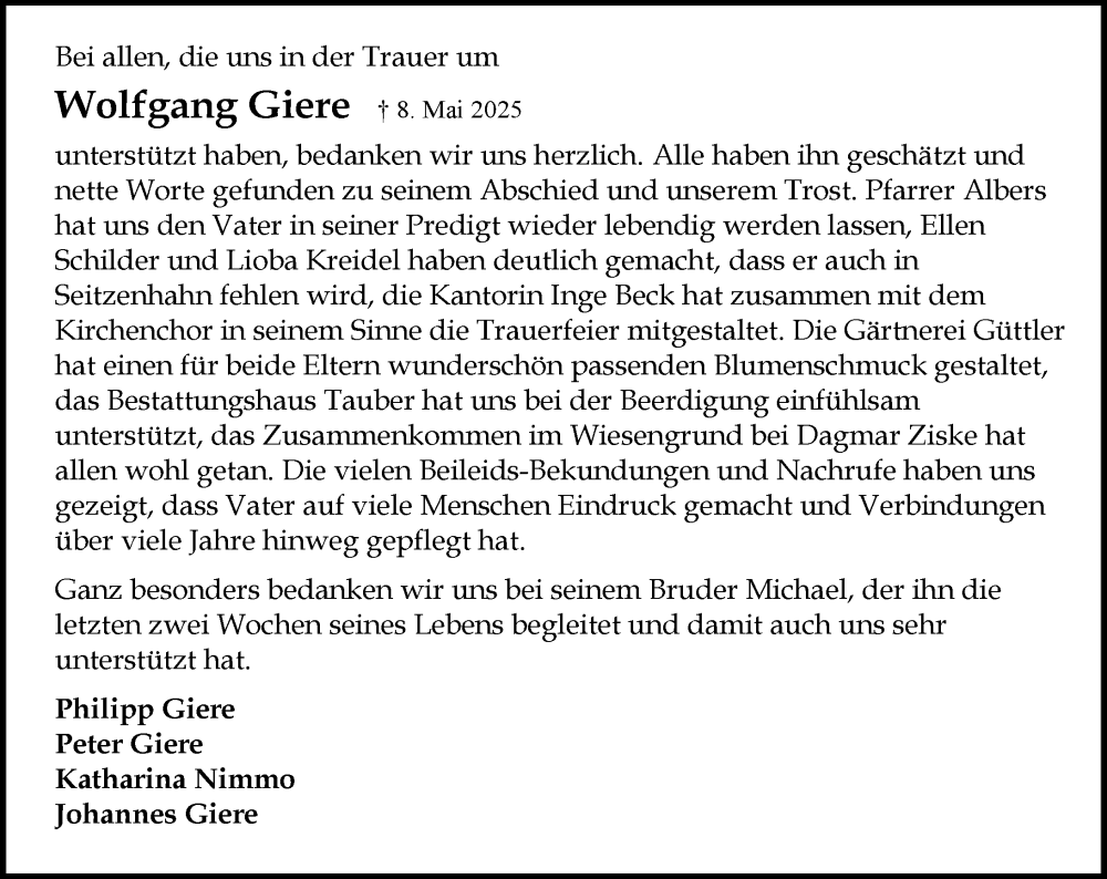Hier finden Sie alle Traueranzeigen aus der Zeitung, die bisher für Wolfgang Giere erschienen sind. Weitere Traueranzeigen, die in der Zeitung erscheinen, werden hier ebenfalls aufgelistet