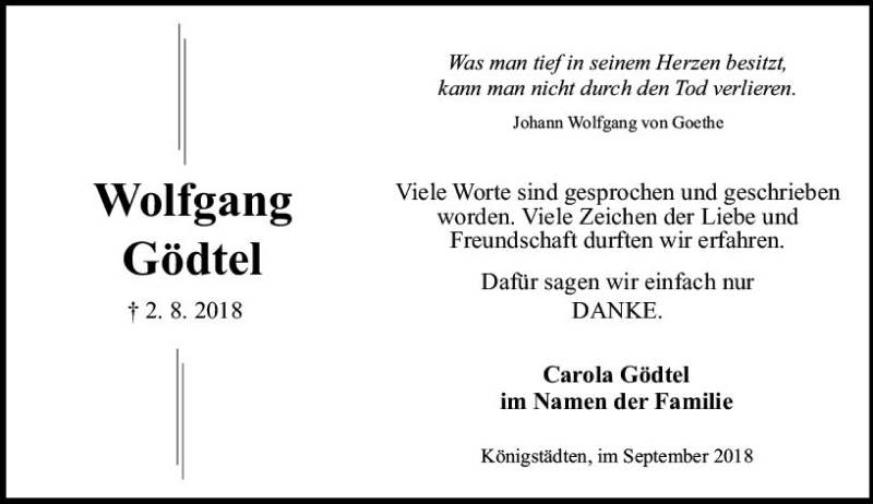 Hier finden Sie alle Traueranzeigen aus der Zeitung, die bisher für Wolfgang Gödtel erschienen sind. Weitere Traueranzeigen, die in der Zeitung erscheinen, werden hier ebenfalls aufgelistet