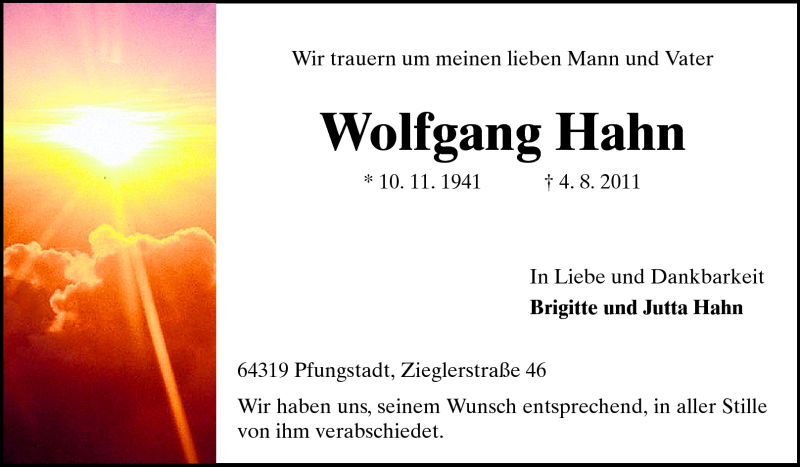 Hier finden Sie alle Traueranzeigen aus der Zeitung, die bisher für Wolfgang Hahn erschienen sind. Weitere Traueranzeigen, die in der Zeitung erscheinen, werden hier ebenfalls aufgelistet