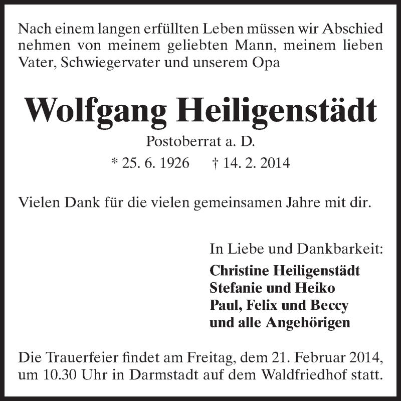 Hier finden Sie alle Traueranzeigen aus der Zeitung, die bisher für Wolfgang Heiligenstädt erschienen sind. Weitere Traueranzeigen, die in der Zeitung erscheinen, werden hier ebenfalls aufgelistet