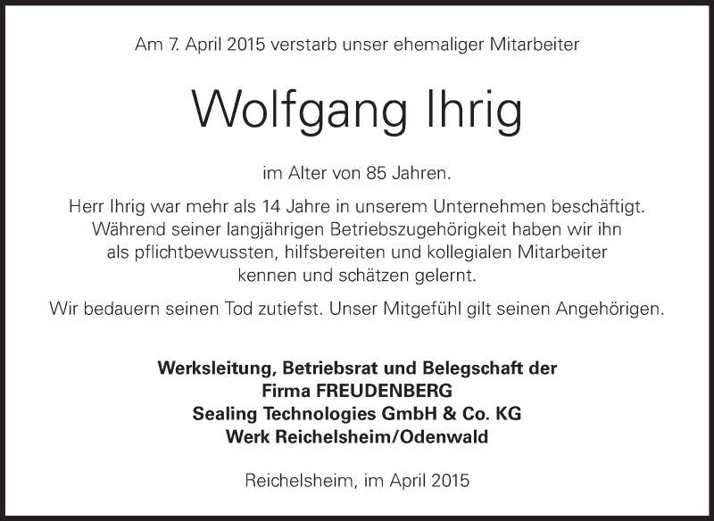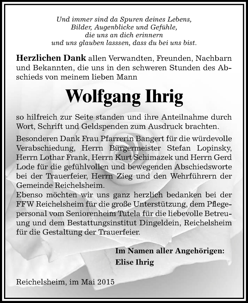 Hier finden Sie alle Traueranzeigen aus der Zeitung, die bisher für Wolfgang Ihrig erschienen sind. Weitere Traueranzeigen, die in der Zeitung erscheinen, werden hier ebenfalls aufgelistet