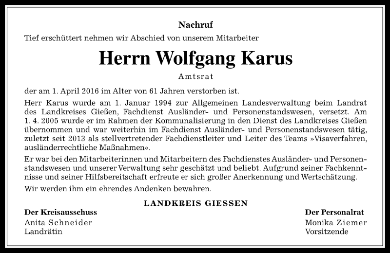 Hier finden Sie alle Traueranzeigen aus der Zeitung, die bisher für Wolfgang Karus erschienen sind. Weitere Traueranzeigen, die in der Zeitung erscheinen, werden hier ebenfalls aufgelistet