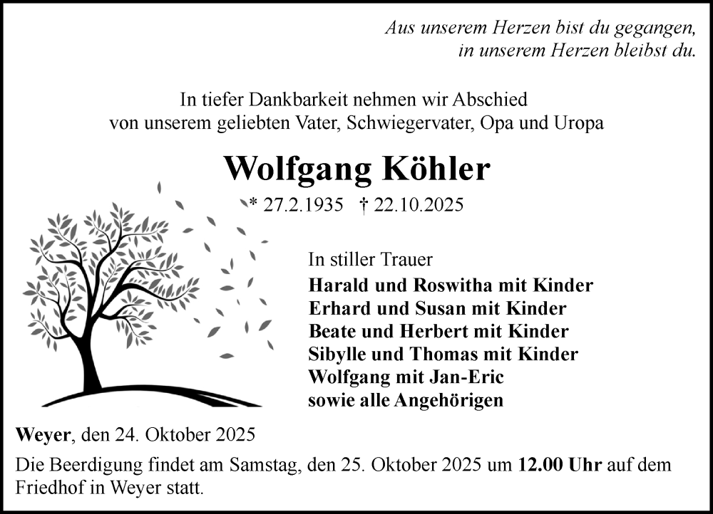 Hier finden Sie alle Traueranzeigen aus der Zeitung, die bisher für Wolfgang Köhler erschienen sind. Weitere Traueranzeigen, die in der Zeitung erscheinen, werden hier ebenfalls aufgelistet