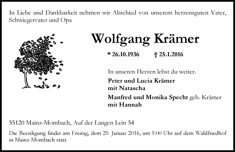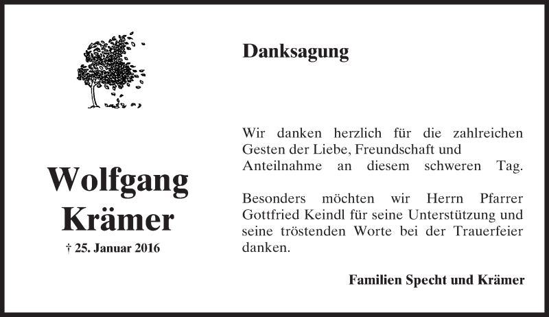 Hier finden Sie alle Traueranzeigen aus der Zeitung, die bisher für Wolfgang Krämer erschienen sind. Weitere Traueranzeigen, die in der Zeitung erscheinen, werden hier ebenfalls aufgelistet