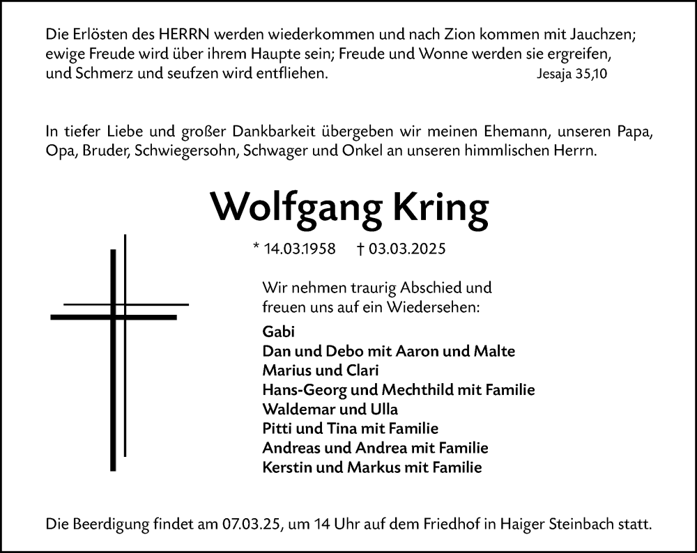 Hier finden Sie alle Traueranzeigen aus der Zeitung, die bisher für Wolfgang Kring erschienen sind. Weitere Traueranzeigen, die in der Zeitung erscheinen, werden hier ebenfalls aufgelistet