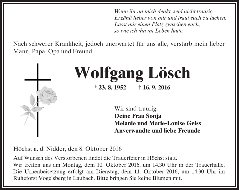 Hier finden Sie alle Traueranzeigen aus der Zeitung, die bisher für Wolfgang Lösch erschienen sind. Weitere Traueranzeigen, die in der Zeitung erscheinen, werden hier ebenfalls aufgelistet