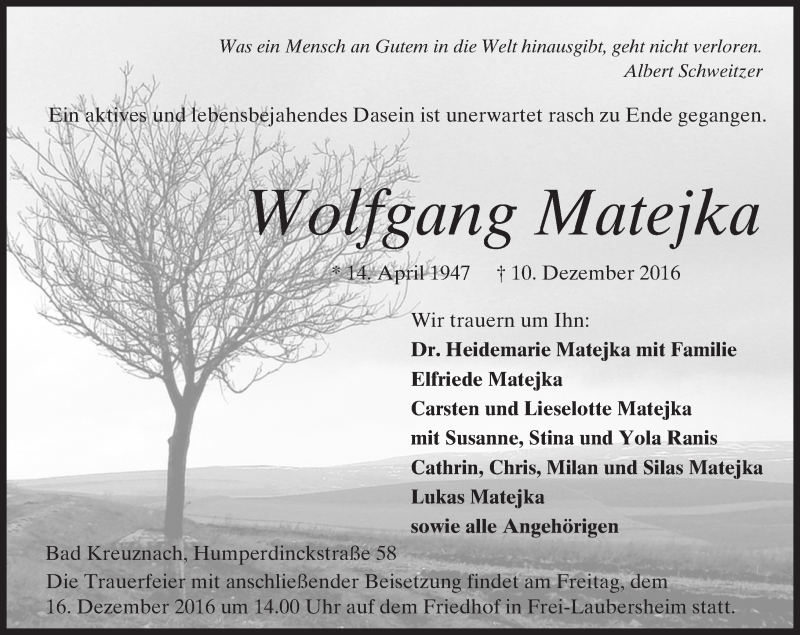 Hier finden Sie alle Traueranzeigen aus der Zeitung, die bisher für Wolfgang Matejka erschienen sind. Weitere Traueranzeigen, die in der Zeitung erscheinen, werden hier ebenfalls aufgelistet