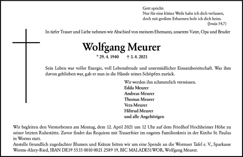 Hier finden Sie alle Traueranzeigen aus der Zeitung, die bisher für Wolfgang Meurer erschienen sind. Weitere Traueranzeigen, die in der Zeitung erscheinen, werden hier ebenfalls aufgelistet