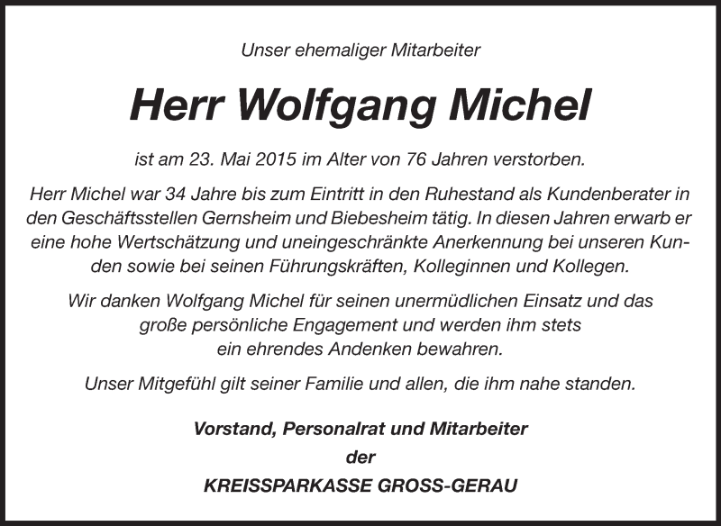 Hier finden Sie alle Traueranzeigen aus der Zeitung, die bisher für Wolfgang Michel erschienen sind. Weitere Traueranzeigen, die in der Zeitung erscheinen, werden hier ebenfalls aufgelistet