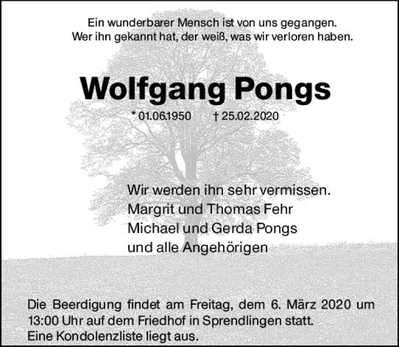 Hier finden Sie alle Traueranzeigen aus der Zeitung, die bisher für Wolfgang Pongs erschienen sind. Weitere Traueranzeigen, die in der Zeitung erscheinen, werden hier ebenfalls aufgelistet