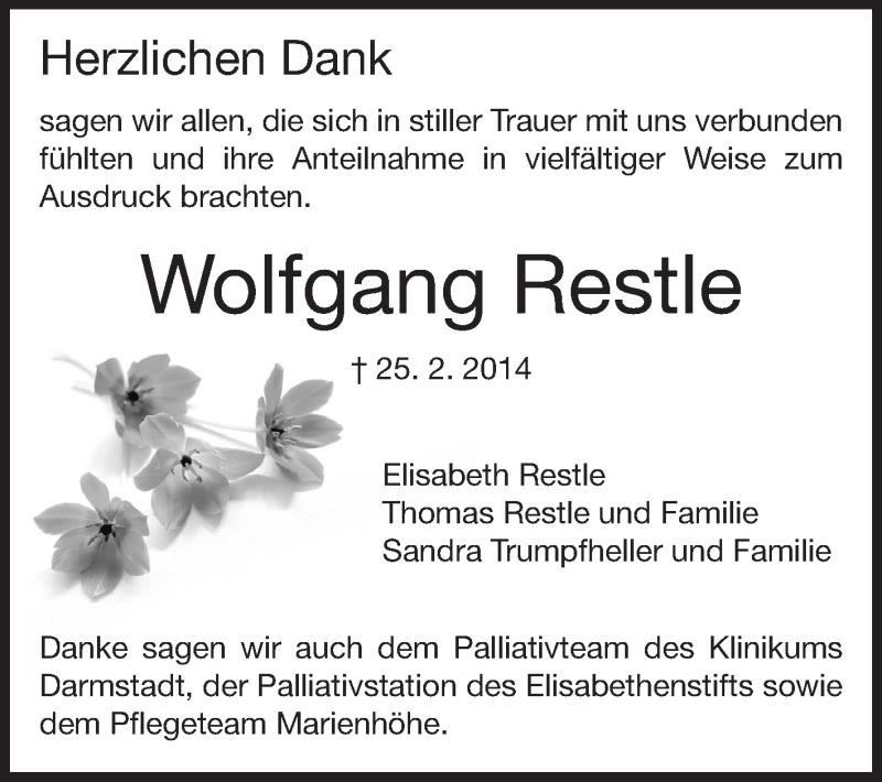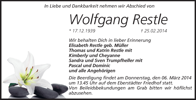 Hier finden Sie alle Traueranzeigen aus der Zeitung, die bisher für Wolfgang Restle erschienen sind. Weitere Traueranzeigen, die in der Zeitung erscheinen, werden hier ebenfalls aufgelistet
