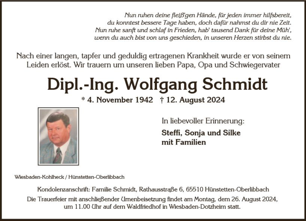 Hier finden Sie alle Traueranzeigen aus der Zeitung, die bisher für Wolfgang Schmidt erschienen sind. Weitere Traueranzeigen, die in der Zeitung erscheinen, werden hier ebenfalls aufgelistet