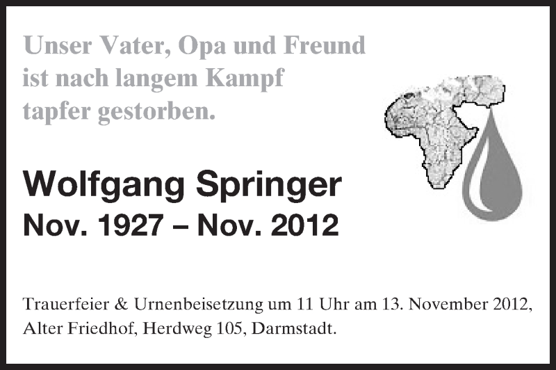 Hier finden Sie alle Traueranzeigen aus der Zeitung, die bisher für Wolfgang Springer erschienen sind. Weitere Traueranzeigen, die in der Zeitung erscheinen, werden hier ebenfalls aufgelistet