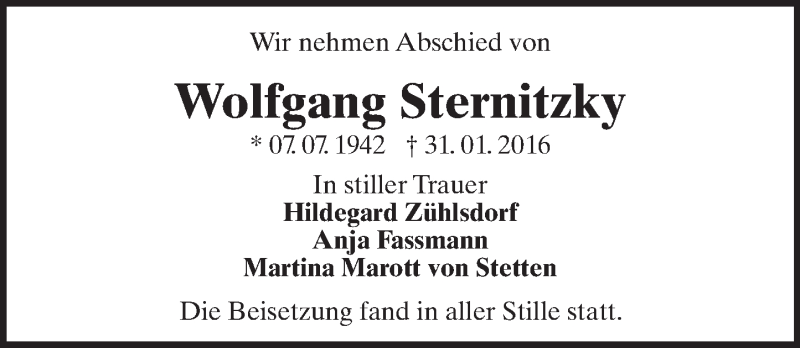 Hier finden Sie alle Traueranzeigen aus der Zeitung, die bisher für Wolfgang Sternitzky erschienen sind. Weitere Traueranzeigen, die in der Zeitung erscheinen, werden hier ebenfalls aufgelistet