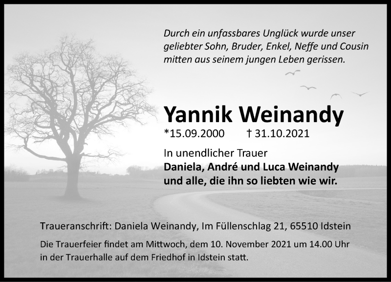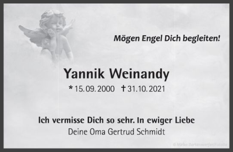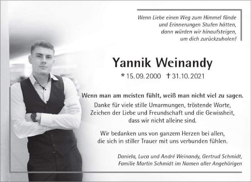 Hier finden Sie alle Traueranzeigen aus der Zeitung, die bisher für Yannik Weinandy erschienen sind. Weitere Traueranzeigen, die in der Zeitung erscheinen, werden hier ebenfalls aufgelistet