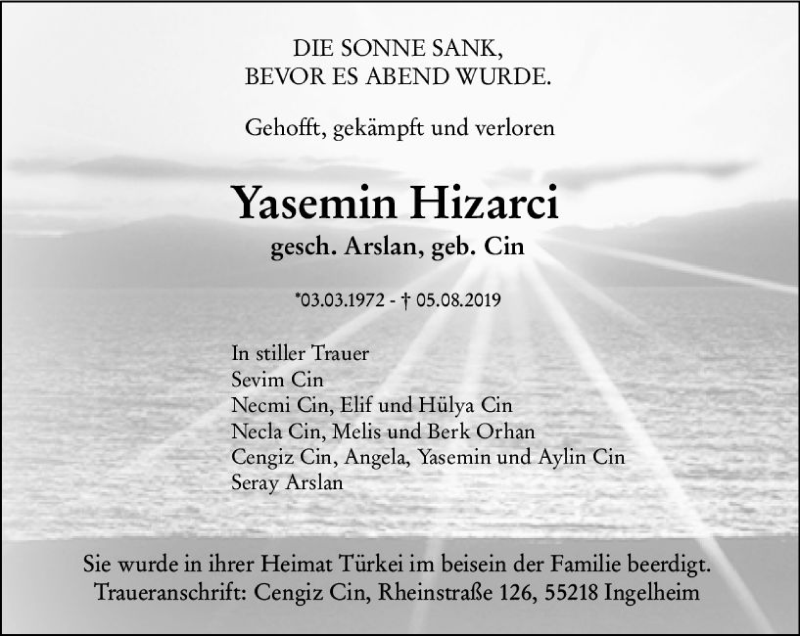 Hier finden Sie alle Traueranzeigen aus der Zeitung, die bisher für Yasemin Hizarci erschienen sind. Weitere Traueranzeigen, die in der Zeitung erscheinen, werden hier ebenfalls aufgelistet